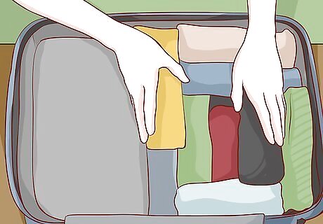 Roll clothing up tightly so items stand up rather than lie flat. Fold items up into neat squares and rectangles as if you were going to put them in a drawer or your closet. Roll the folded clothing up into neat little bundles and place them standing next to each other. Using this method ensures that the clothing items take up as little space as possible. The rolled items are easier to pack efficiently and you’ll also be able to find and unpack items to wear more easily.