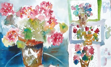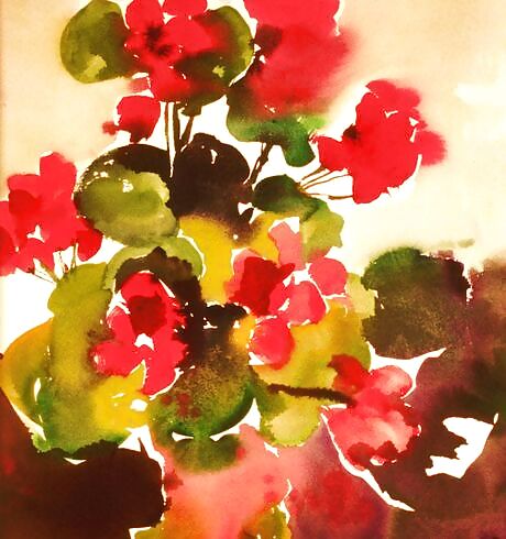 Do an abstract painting. Doing an abstract painting is fun. You might title this work, “Geraniums in my Sleep.” In it, you will be responding to the colors you see before you, eliminating all details. If you look at your subject and squint, what do you see? Bright red balls on spindly stems, grounded by green, round leaves. Remove paper from the pad. Immerse your watercolor paper in clear, cold water for a few minutes to thoroughly saturate it. Pull it out of the water, give it a shake and set it on towels to begin to dry. Avoid dabbing or helping it dry, just let the air do its job. When the surface of the paper starts to go dull, it’s time to paint. Note you will paint directly, no preliminary drawing. Charge a large brush with barely diluted pasty paint. Add only a small amount of water to make the paint the consistency of toothpaste. The water is already on the paper. Pretend you are communicating only the most elemental aspects of this flower. Purposely try to make shapes that are telling, but without details. The paint will fuzz out from where you put it. Wait a little longer to start painting if your colors dissipate too much. Think of your work as a jig-saw puzzle and work in general shapes and areas. Fill in missing areas between your initial spots of color with other random colors. Quit sooner than later and allow to air dry. It will not only glow, it will have energy and may or may not resemble the geranium. It will say things about the subject in a primal way.