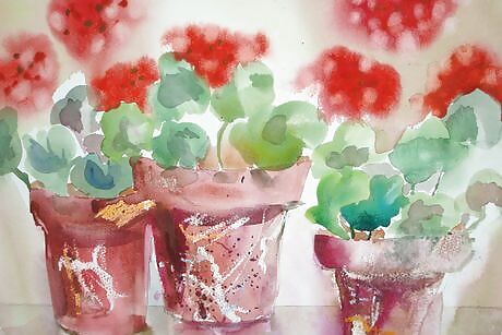 Try the simple “Geraniums in Distressed Pots.” It employs a resist technique using wax crayons. Sketch a row of geraniums in terracotta pots. Give the pots some texture using wax crayons. Press hard to get a lot of wax on the pots and don’t over think it. Just scribble. The pots will be a featured element of the painting because you are giving them this interesting texture. Using a loaded brush, wet the paper with water. Wait a minute or two before you begin to paint. Paint the red circles for the blossoms while the paper is still quite wet to give them the opportunity to fuzz and spread. Immediately, accent the wet blossoms with spots of orange. Move to the leaves and paint them green. Do the pots in a red-brown color to resemble the most basic of garden pots. The wax will cause the paint to separate and resist the color.
