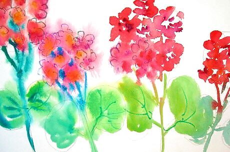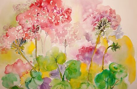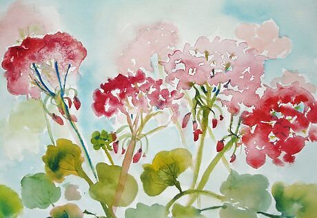 Let a wet water spot create a flower. This technique is fun and easy. On your paper, sketch a number of abstract circles for geranium blossoms. Keep the paper flat and dry, but generously wet the circles. Add enough water for it to rise above the paper's surface. Let it soak a minute or two. Drop in color from the tip of your brush and let them merge at will. Leave them completely alone to dry naturally. This will take some time, but resist the urge to help things along. The paint will be pulled to become outlines for the flower shapes. Now is the time to paint, by clarifying the flower's mass into separate, little blossoms with a small, pointed brush. Paint the stems, leaves as you wish, using the wet-into-dry method, or a combination of that and wet-into-wet. However you do it, it is sure to shine and show off the geranium in a lovely way.