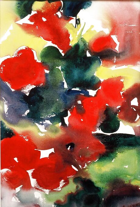 Try doing a painting called, “Summery Geraniums.” Painting on saturated paper much like painting on super-soaked paper. Follow the same procedure as for the abstract work, remove the paper and put it to soak, only allow the paper to dry much longer before painting on it. The paint you apply will stay where you put it. Since it won’t move and fuzz as much you can put in much more detail. You will also do a preliminary drawing to guide your strokes. In this piece, you will be attempting to paint what you see before you, trying to capture its shape and details. Go slower and think about where you are putting the colors. Again, use rich colors, barely diluted because there is so much water in the paper. Thinner paints will dissipate and details will be lost.