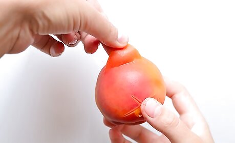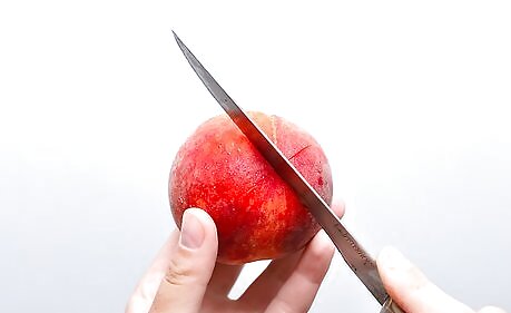 Score the peaches with an X. Use a sharp knife to make an "X" shape at the pointy tip of each peach (not at the stem cavity). When the peaches are being blanched the fruit expands, stretching the skin, then, when the fruit is iced, the fruit shrinks leaving loose, easy-to-peel skin. Don't score the peaches too deeply, or make the Xs too big or the peaches may fall apart in the hot water. Medium length incisions 1-2" (3-5cm) long which just break the skin are all you need.