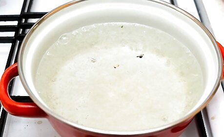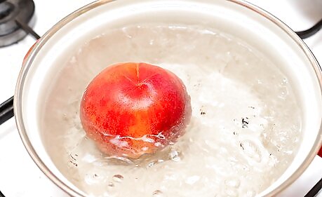 Boil a big pot of water. The vessel should be large enough to comfortably fit three or four peaches. Don't try to blanch more than four medium-sized peaches (or three large ones) at a time.—Putting a larger mass of peaches into the water will lower its temperature and disrupt the blanching, making the process less effective. Choose a Dutch oven or large pot (or saucepan) and fill it three-fourths the way with water, then bring the water to a rolling boil.