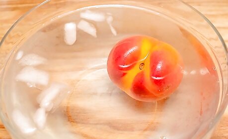 Prepare an ice bath. Fill a large bowl three-fourths full of ice cubes in water. This ice bath will be used to quickly cool the peaches after blanching. Quenching in the ice bath, arrests the cooking process and assures that the peaches don't end up mushy.