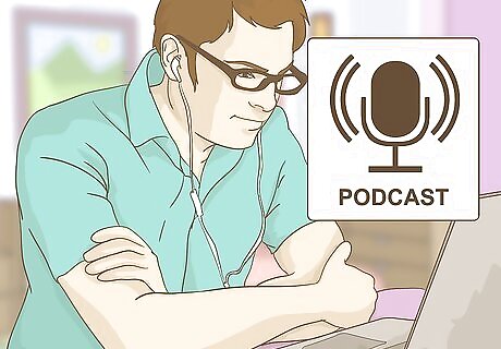 Listen to the radio or podcasts in English. Your commute is a great time to practice your English skills. Whenever you're in the car, flip to an English radio station. Listening to people go back and forth in English can help you pick up on certain words or phrases people employ often in dialog. If you're listening to a radio interview, imagine how you would answer the questions. Try to practice and interact as much as possible. No one's looking!