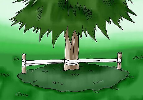 Stake your tree to keep it upright. Place one or two stakes around your tree – away from the roots but still within the mulched area. Tie the tree to the stakes using a flexible material like canvas straps. The stakes can be removed after about a year.