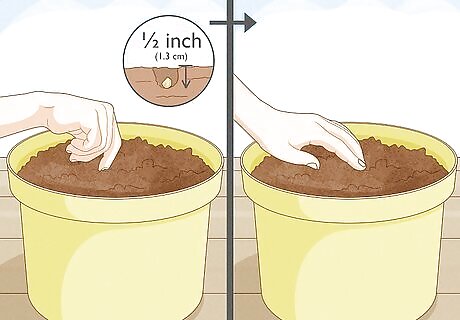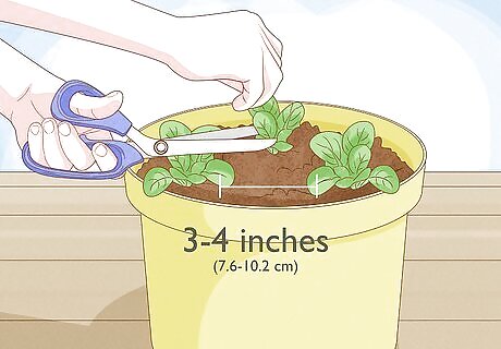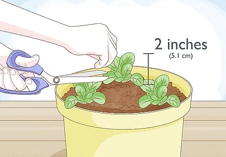 Space your seeds apart to allow proper growth. Plant your seeds about 1 inch (2.5 cm) apart to allow proper growth. Once they begin to grow, use garden shears or scissors to trim them so they're 3 to 4 inches (7.6 to 10.2 cm) apart. Keep the strongest seedlings and cut the weaker sprouts to the ground.