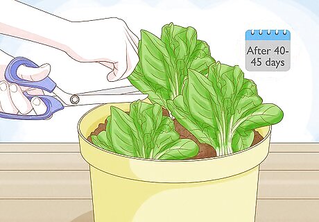 Remove your spinach leaves after 40 to 45 days if you want adult spinach. For harvesting adult plants, ensure that they have at least 6 leaves that are around 4 inches (10 cm) long. Use garden shears to cut the outside leaves and ensure the plant will continue producing in its container. Once it has grown a tall flower stalk, harvest the plant by cutting the main stem. Bolting occurs when spinach plants send up a seed stalk that eventually flowers. Flowering turns the leaves bitter and inedible. If mature plants begin to grow taller in a short period of time, it's a sign of bolting – pull up the whole plant and harvest its leaves.