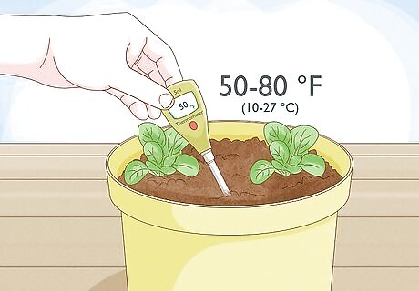 Monitor soil temperature using a soil thermometer. After you put your plants in their chosen position, keep an eye on soil temperature using your thermometer. Spinach seeds germinate in temperatures as low as 40 °F (4 °C), although the best range is between 50 to 80 °F (10 to 27 °C). The absolute minimum is 20 °F (−7 °C) and maximum is 90 °F (32 °C). Spinach is very sensitive to heat. Anytime soil temperatures are over 75 °F (24 °C), move it into the shade to be safe.