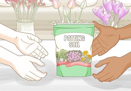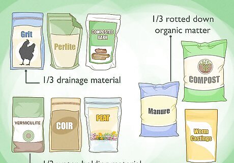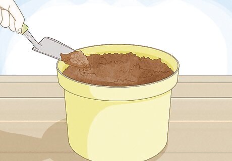 Create your own potting mix if you have the time. If you're preparing your own potting mix, use 1/3 drainage material (grit, perlite, composted bark), 1/3 water-holding material (coir, peat, vermiculite), and 1/3 rotted down organic matter (manure, compost, worm castings). Sprinkle ⁄2 cup (120 ml) some organic sources of nitrogen such as soy meal or alfalfa meal into the center of the pot and claw it into the bottom of the soil. Top it with 3 to 4 inches (7.6 to 10.2 cm) of potting mix. You can also add animal-based amendments like worm castings, fish meal, feather meal, or composted manure. Add ⁄4 to ⁄2 cup (59 to 118 ml) bat guano to the potting soil to provide it with high-quality nutrients. If you have a lot of pots to fill, it's usually less expensive to mix your own potting soil instead of buying a commercial potting soil.