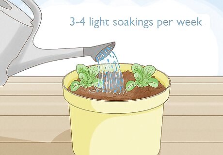 Water your spinach plants often to prevent the soil from drying out. Spinach does best with 1 to 1.5 inches (2.5 to 3.8 cm) of rainfall per week. If you're not getting rain, give them 3 to 4 light soakings per week. Pot-grown plants require plenty of moisture—always check to ensure that the soil hasn't dried out. Keep the soil consistently damp, but never soggy. Too much moisture can harm growth as well. Never let your spinach plants dry out during the summer, as this will lead to bolting and can harm growth. Spinach that has bolted is still edible. However, it's tougher and tastes more bitter.