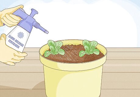 Fertilize your spinach plant's soil regularly. You can encourage the growth of your spinach plants by fertilizing them with continuous-release plant food or liquid fertilizer. Use products that contain lots of nitrogen. Use slow-release fertilizer. Organic fish emulsion or cottonseed meal are two alternative options.