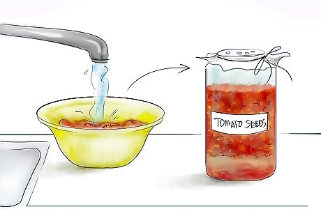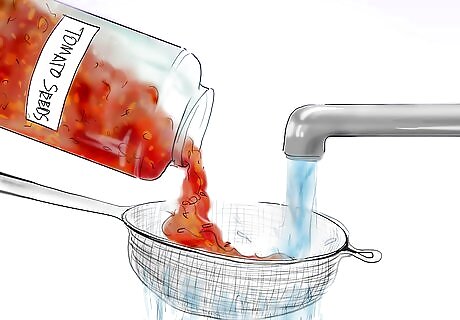 Rinse the seeds. After several days, you will notice that the juice and flesh from the fruit has created a scum at the top of the water, while the seeds have sunk to the bottom of the dish. When this has happened, scoop off the stuff floating near the top and then pour the seeds and water into a sieve. Rinse with lukewarm water, making sure that the seeds are completely clean.