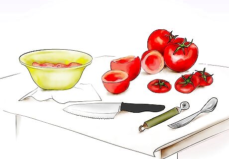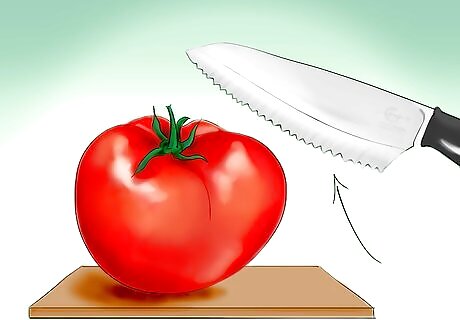 Halve the fruit. Use a sharp knife to cut your tomato in half down the equator (running through the stem). Do this over a cutting board or bowl so that you can easily gather the seeds and juicy innards from the fruit for preservation.