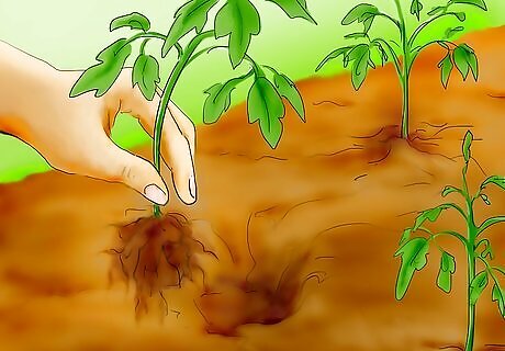 Water the plants. Water your tomatoes more frequently at first (daily), and reduce the watering frequency as they mature. Always give them a thorough watering so that water penetrates the soil. Frequent, shallow waterings will lead to shallow roots and a weak plant. Watch your plant's leaves for signs of drying out and water accordingly. If you don’t have time for daily waterings, look into installing a sprinkler or drip system in your garden.