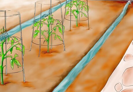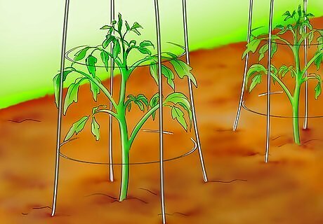Place your cages. If you plan to have your tomatoes caged, add them at this point. Make a tomato cage out of the wire used for laying concrete, or a similarly large-spaced wire grid. Avoid tying the plant to the cage or stakes until after it has flowers.