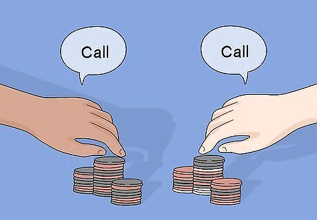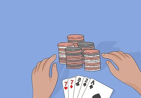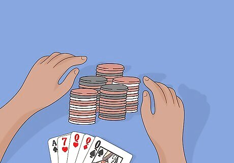 Let the player to the left of the dealer button call, raise, or fold. They should look at their hole cards without showing them to anyone, and decide if they want to bet or fold. Since there won’t be any face-up community cards at this point, they’ll need to decide based on just their hole cards. If they choose to call or raise, they should put their bet in the center of the table. If they choose to fold, they should discard their cards. Keep in mind that the minimum bet is equal to the big blind. So, if the first player wants to stay in, they’d need to bet at least what the big blind is. For example, if the big blind is $2.00, the first player could bet $2.00 to call or more than $2.00 to raise.