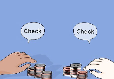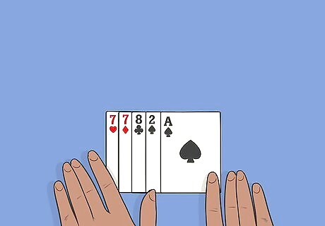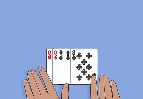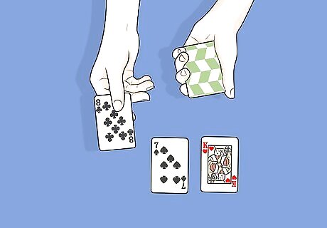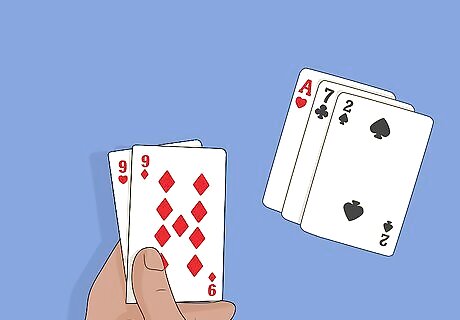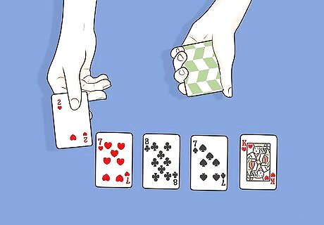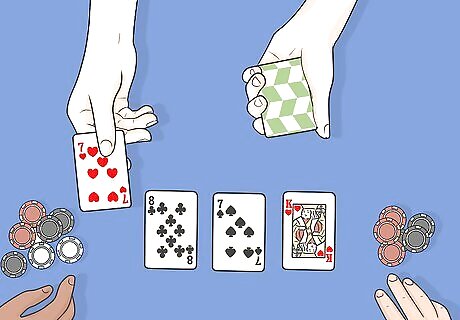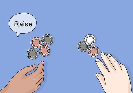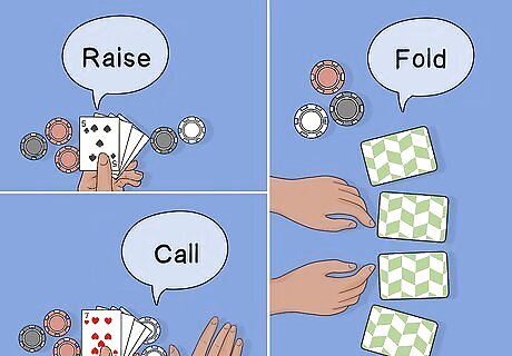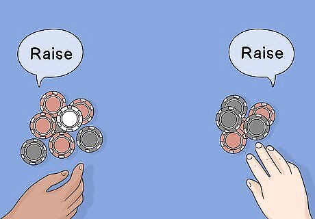 Have the remaining players bet again. Continue betting in the same way, going around the circle clockwise. Only the players who haven’t folded yet should still be betting at this point. Remember that, when it’s your turn to bet, you always have 3 options. You can bet the same as the previous player to call, you can bet more than them to raise, or you can discard your cards to fold.