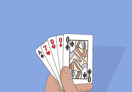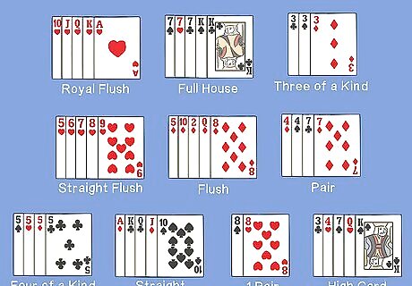 Learn the different hand rankings for poker. Omaha Hi Lo uses the same hand rankings as other kinds of poker. In order to play, you’ll want to memorize the different rankings (or have them written out in front of you if you’re playing at home) so you can bet strategically. The hand rankings in order from best to worst are: Royal flush: 10, jack, queen, king, and ace in the same suit. Straight flush: any straight in the same suit, like 2, 3, 4, 5, and 6 of hearts. Four of a kind: 4 cards of the same rank. Full house: 3 cards of the same rank plus 2 cards of the same rank. Flush: any 5 cards that are the same suit. Straight: 5 cards that are consecutive in rank, like 6, 7, 8, 9, and 10. Three of a kind: 3 cards of the same rank. Two pair: 2 cards of the same rank plus 2 different cards of the same rank. One pair: 2 cards of the same rank. High card: can be any card, but the higher the better (ace is the highest).