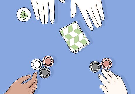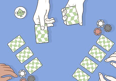 Wait for the dealer to pass out 4 cards face down to each player. The deal should start with whoever is sitting to the left of the player with the dealer button. Then, it continues clockwise. The dealer should pass out 1 card to each player at a time, going around the circle a total of 4 times so every player has 4 cards. When playing at a casino, the employee at the table will deal for you. If you’re playing at home, have the player with the dealer button deal out the cards.