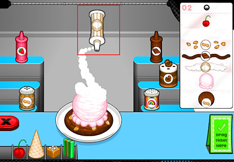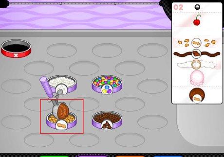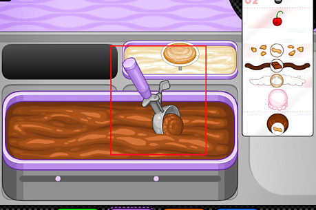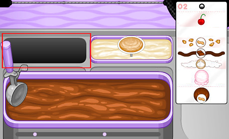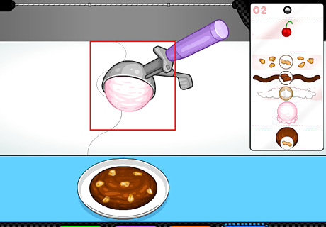 Play Papa's Scooperia P4S3.pngScoop the ice cream slowly in a clockwise motion. There will be a circular ice cream container with the flavor you chose. Scoop it slowly from top to right to bottom to left and back up. The ice cream bar doesn't turn red, but the scoop will turn out smaller if you go too fast. Try to follow the yellow dots on the border with your cursor.