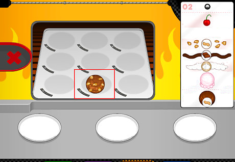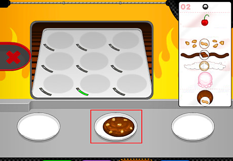 Drag the cookie to a plate when it's done baking. There are three white plates below the stove. Drag the cookie to one of the plates quickly once it's finished baking!