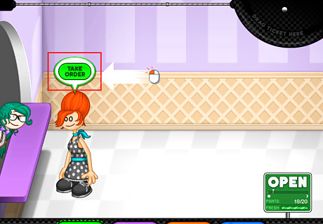 Drag the appropriate order ticket to ticket holder. It has a green check on it that says "DRAG TICKET HERE". It's to the right of the finished dessert. This completes the order, so double-check to be sure you got everything right. If not, add the things you missed or redo the order for things you messed up. Redoing the order takes up more wait time, giving you fewer points resulting in fewer tips and unhappy customers. If you have multiple order tickets, check the order number in the top left of the ticket or match the order to the order on the ticket.