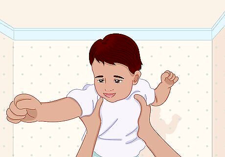 Hold your baby and slowly fly them around. Once your 6 month old can hold up their own head, lift the baby into the air. One hand should support under the toddler’s bottom and the other hand should go across their chest. Have fun zooming them around the room while you make airplane or rocket noises. Your baby will enjoy the different view and feeling of movement. Always support your baby and avoid spinning so quickly that you become dizzy while holding the baby.