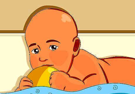 Splash around in the tub or kiddie pool. To help your baby develop body awareness, fill a small pool or tub with about 2 in (5 cm) of water. Get in the tub or pool with the baby and let them splash and experience the water. Set scoops, balls, or toys in the water for them to play with. If your baby can sit up confidently, sit next to them to help keep their balance. Keep constant supervision of your baby while they are in water and always be within reach.