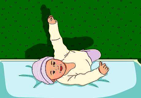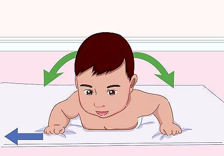 Encourage tummy time. Your baby's pediatrician has probably already told you about the importance of putting the baby on their tummy to develop important motor skills. To make this more fun, lay your baby on a towel and get down on your belly next to them. Gently tug the sides of the towel so the baby rolls a little. As you roll the baby, sing something like, "Oopsy daisy!" Make eye contact with the baby and be playful as you encourage them to lift their head. If your baby doesn’t like tummy time, try laying the baby on their tummy so they are supported by your shins or so they are on a table in front of you. Always keep at least 1 hand on your baby for security.