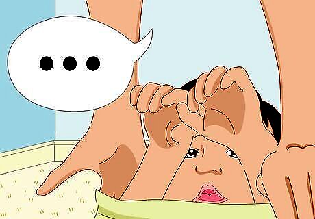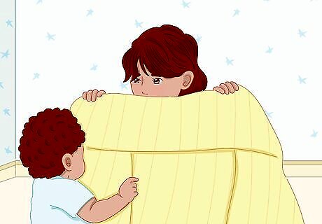Play peekaboo. If you want to help the baby develop cognitive skills and learn about object permanence, simply play peekaboo. Cover your face with your hands or a blanket and then pull them away to quickly reveal your face. Say, "Peekaboo!" in a fun voice as you show your face. Do this several times to make it fun for the baby. As your baby gets older, you can keep your face covered for longer. Try making silly faces as you reveal your face.