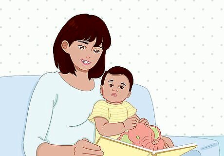 Sing and read to your baby every day. Get out board books that you can thumb through with the baby. Since many of these don't have lengthy stories, point to images and describe them. Get your child interested in stories and communication by singing or repeating their sounds back to them. Great songs for babies include:< The Wheels on the Bus Old MacDonald The Itsy Bitsy Spider The Hokey Pokey