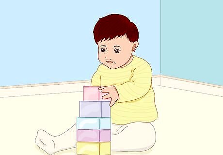 Set out stacking toys or blocks. The baby might enjoy holding a few stacking rings or blocks. Get them to stack a ring on top of another or make a small tower with a few blocks. Consider using soft blocks that won't hurt your baby if they fall over on them. The blocks or rings should be easy for your baby to grip. Give the baby two items to hold in their hands. Then, hold up another item and let the baby decide if they will drop one item to replace it with the new item. This activity teaches problem solving as they decide what to keep and what to let go. Talk with your baby as they play with the stacking items. Tell them about the shapes and colors of the objects they're handling. For example, say, "You're stacking the red ring."