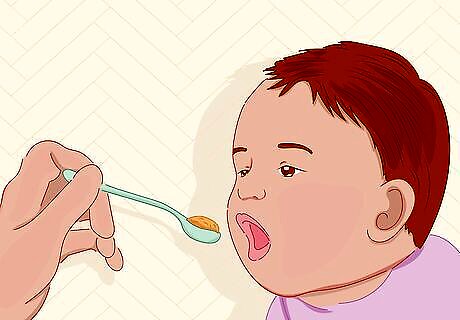 Make mealtime fun. Since your 6 month old can begin eating solids, get out soft purees or blended food. To help your baby get used to eating from a spoon, scoop a little on the end of the spoon and fly it around. Make fun sounds before "landing" in the baby's mouth. For example, say, "Here comes the little engine. Chug, chug, chug, open your mouth!"