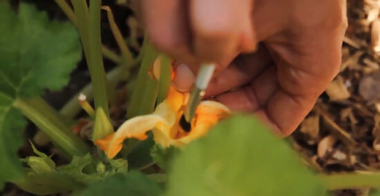 Collect pollen from the stamina. Use a brush or cotton swab to touch the stamen of your flower. Be careful not to push too hard with your brush. Coat the brush as well as you can with pollen to ensure an effective pollination.