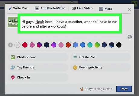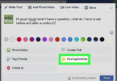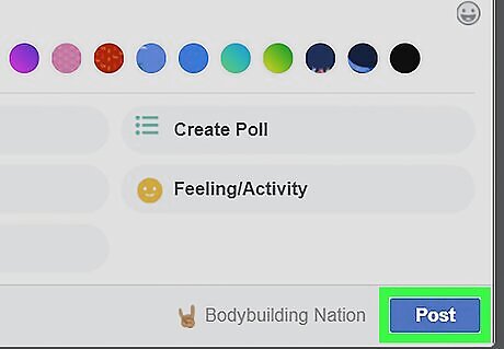 Type your post. Anything you type here will appear in your post. To add emoji, click the smiley face icon at the bottom-right corner of the box you’re typing in. If your post is on the shorter side, you’ll see various color and pattern options beneath the “Write Something” box. Try clicking of the options to make your post stand out from the crowd.