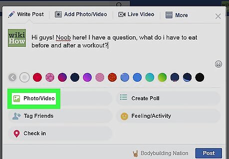 Click Add Photo/Video to upload something from your computer. You can skip this step if you don’t want to add photos or videos. Otherwise, this brings up two options: Choose Upload Photos/Videos to add a single photo or video to your post. When your file browser appears, double-click the image or video you want to post and it will attach to your message. To upload multiple photos and/or videos, click Create Photo/Video Album, hold Ctrl (Windows) or ⌘ Command (macOS) as you click each file you want to add, then click Open.