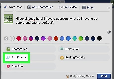 Click Tag Friends to tag friends in your post. Also optional, but this will add a blank for you to type the names of a few Facebook friends who are relevant to whatever you are posting. These friends will be notified that they’ve been tagged (as long as they have permission to access the group).