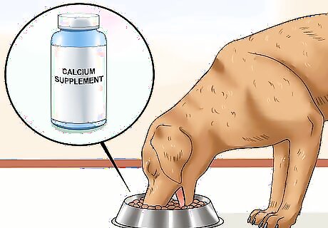 Supplement the calcium and vitamins in your dog's diet. If you're just feeding one homemade meal for your dog, you can skip the supplement. However, if you're planning to regularly feed your dog homemade meals, you'll need to give him a dietary supplement. A supplement will ensure that your dog gets enough calcium, vitamin D, vitamin E, and other essential minerals. You can find calcium supplements at your pet store. Choose one that will give your dog 800 to 1,000 mg of calcium for each pound of food feed. Ask your veterinarian to recommend a vitamin and mineral supplement specific for your dog's needs.