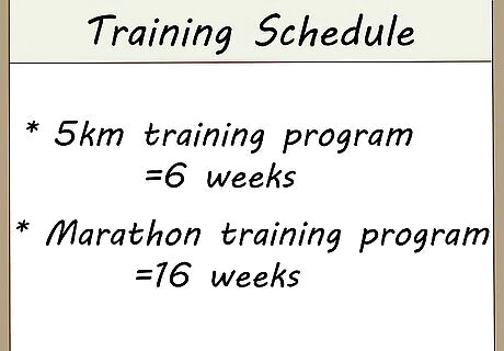 Develop a training schedule. The most successful training schedules incorporate consistency and variety harmoniously. The purpose of creating a schedule is to give yourself time to master a distance and then challenge yourself to raise it slowly until you’ve hit your distance goal. Start by determining how far you can already run. If you can do an eight to ten mile run every week, you should train for a marathon for 18-20 weeks. If you cannot, you may need to train for longer or you might consider a shorter race. Use the 10% rule when creating your schedule, which says that you should not increase your mileage by more than 10% from week to week.