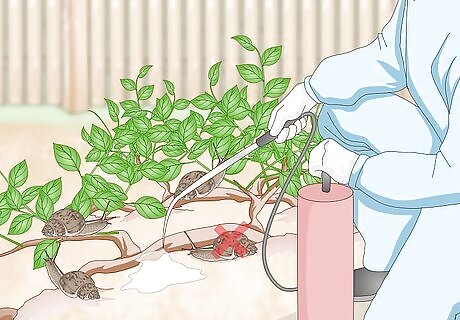 Locate and remove garden pests throughout the growing season. Before you plant your garden, look out for hibernating pests, like slugs, snails, and aphids. They hide in the tops of perennial plants for shelter during the winter. If you find pests in your potting soil, replace it with a fresh mix. You can kill pests as you find them, and use garden pest control methods like sticky traps, oil sprays, and parasitic nematodes when needed. White vine weevil larvae live in compost and feed on plant roots. Keep an eye out for them as well!