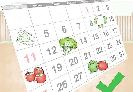 Create a planting calendar to plant your seeds outdoors appropriately. You can plant cold-season crops early in the season, and plant warm-season crops after there is no risk of frost. To keep track of when to plant, make a list of everything you are planting, and list their germination times. Then, list the approximate day to plant them, based on each plant's growing conditions. For example, cool-season crops include broccoli, Brussels sprouts, cauliflower, cabbage, lettuce, and onions. Warm-season crops include tomatoes, peppers, and eggplant.