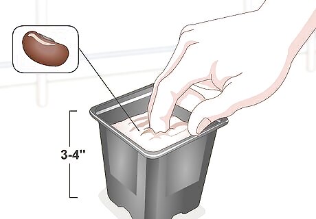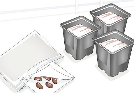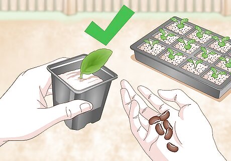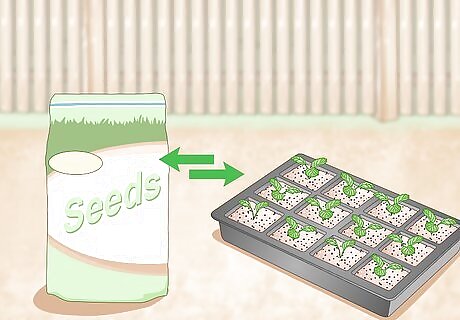 Plant your seeds in individual containers 3–4 inches (7.6–10.2 cm) deep. You can use virtually any small container with individual units to grow your seeds. Select your container, and fill it with seed-starting potting soil up to about ⁄4 inch (0.64 cm) below the top. Then, place 1 seed into each of your containers. Keep your seeds in ample sunlight for 6-12 hours a day to grow healthy seeds. Some seeds should be buried deeper in the soil than others. To find out how far down to place your seeds, check your seed packaging. You can use recycled containers like yogurt cups, Keurig coffee cups, egg cartons, or ice cube trays. Make drainage holes in the bottom of each container with a drill or knife.
