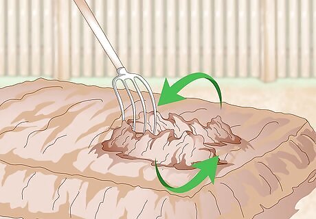 Turn your soil using a pitchfork, shovel, or a rake to clear away weeds. Once your garden bed is cleared away of lawn debris, take a rake or a pitchfork, and go over all of your soil. This helps turn the soil over and remove weeds from your garden. If your soil is dry or crumbly, you can use a shovel or digging fork to help break it up. If there are stubborn weeds still present, rip them out with your hands. Do this about 2-4 weeks before you plant your crops.