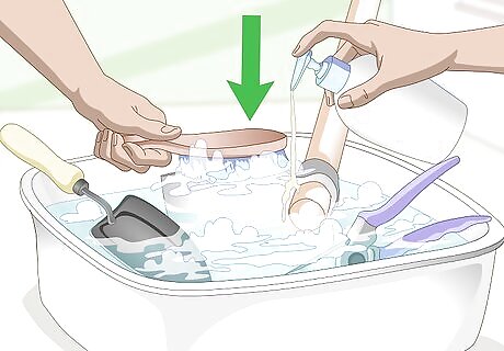 Clean your garden tools with soap and water before you use them. To avoid contaminating your soil or plants, wipe down your garden tools with a soapy sponge or washcloth, then rinse them with water. Seeds are sensitive, so it is important to keep all tools clean. Wash your rakes, shovels, and hand spades, for example.
