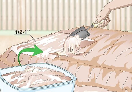 Add ⁄2–1 in (1.3–2.5 cm) of compost 2-4 weeks before you plant. After your garden bed is turned over, spread an even layer of compost over the top of your soil. You can use a garden spade or a rake to help you spread the compost. For best results, add a 1 in (2.5 cm) layer of compost. Heavy clay and sandy soils require more compost, spread a 4–6 in (10–15 cm) layer of compost and till it into the soil. You can scoop compost from an existing compost pile using a shovel, or you can purchase bags of compost material from a garden supply store.