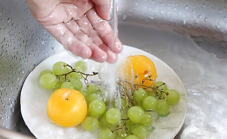 Rinse your fruits and vegetables in clean water. Run the food under cold water to remove any bacteria, dirt, insects or pesticides. You should do this for produce with skin as well, such as bananas and avocados. Use a clean vegetable brush to scrub items with a firm surface, such as melons and cucumbers.