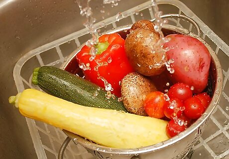 Wash 6 red potatoes, medium zucchini, medium yellow squash, pepper, 15 mushrooms and 15 cherry tomatoes.