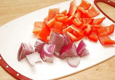 Cut a medium red onion and a medium red or green pepper into 1-inch (2.54 cm) pieces.