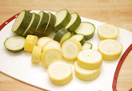 Cut a medium zucchini and a medium yellow squash into approximately 12 rounds each.